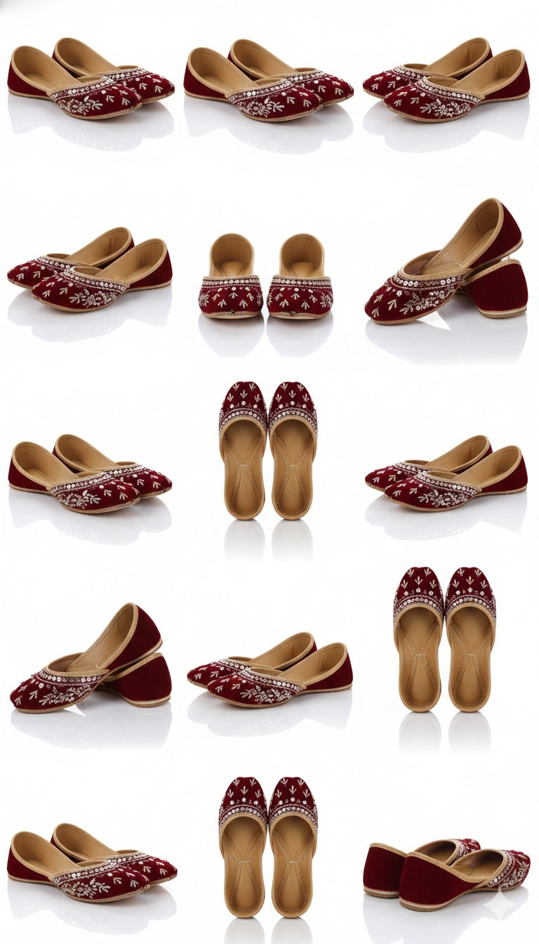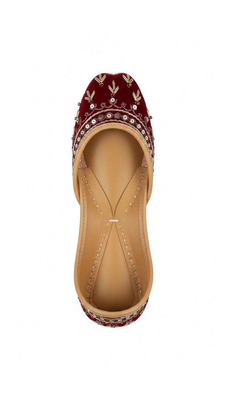 This product is a dark-red, hand-embroidered jutti (mojari) featuring heavy embroideries like nakshi work and zardozi work. It has a slip-on fastening and the upper material is synthetic with a leather sole. The design combines traditional ethnic style with a modern, comfortable fit.